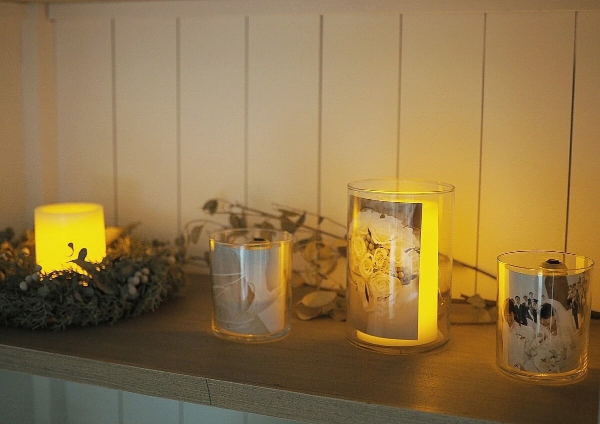 ガラスの容器に写真とともに入れてフォトフレーム兼ライトがわりに。