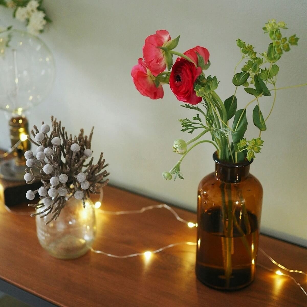 私がよくやるのが、お花と一緒にディスプレイする方法。主張しすぎない小さな光は、お花の引き立て役に最適なんです。
