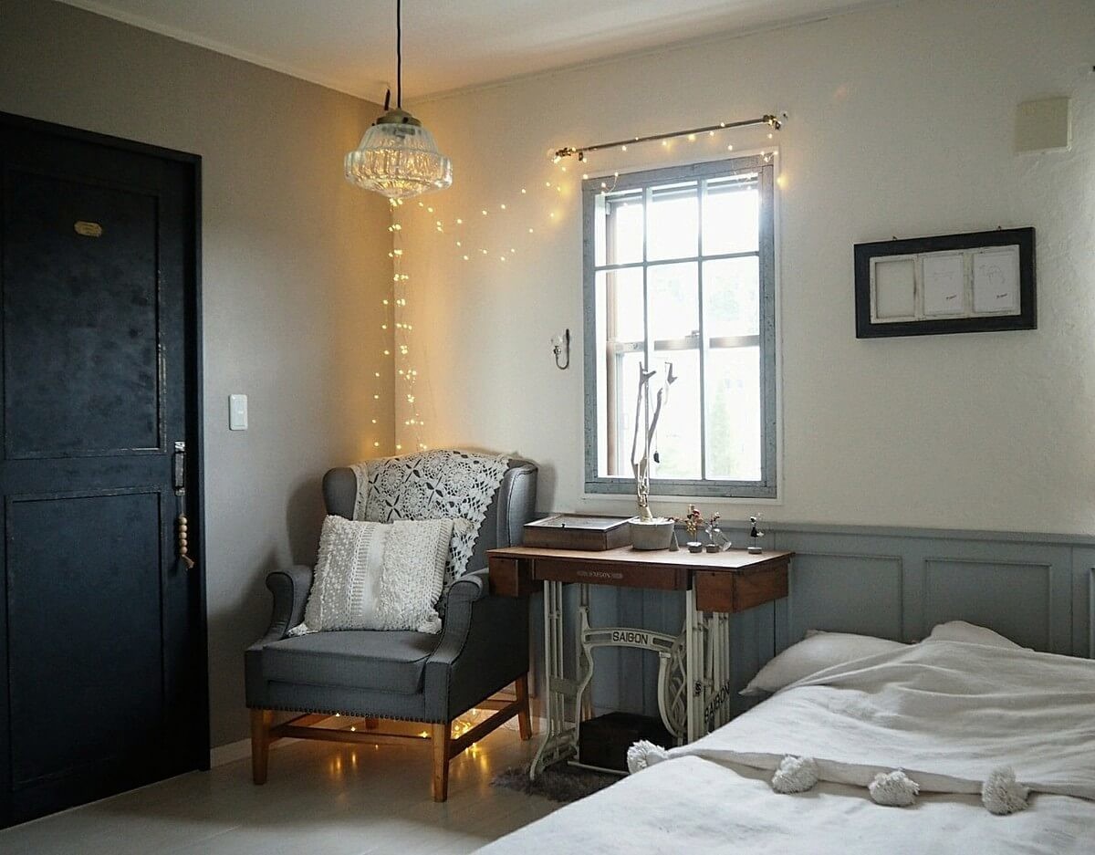 ワイヤータイプなので自由自在に飾れて、フックを使えば天井から吊るすのも簡単です。 寝室の椅子の上にディスプレイしたら、何気ないいつもの空間が幻想的で非日常的な雰囲気へと早変わりしました。
