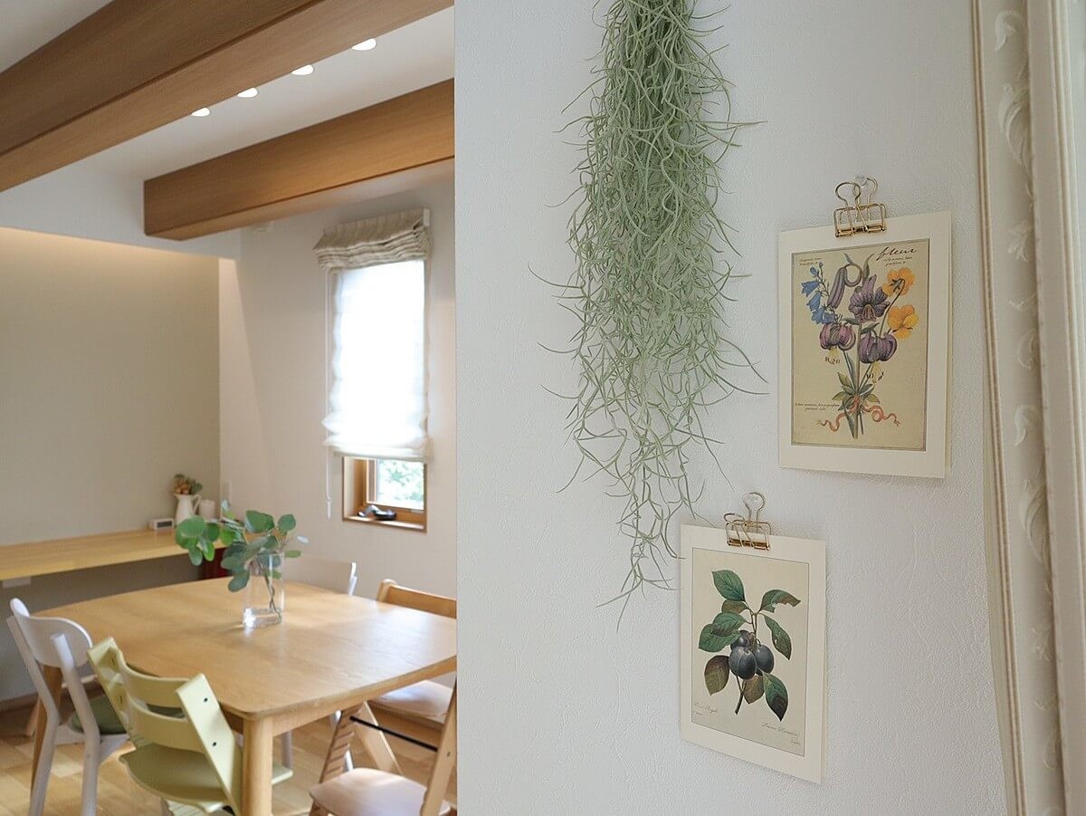 この飾り方は、飾りたいものをクリップに挟むだけ。穴を開けずに飾れるし、気分によって飾るものを変えることもできます。