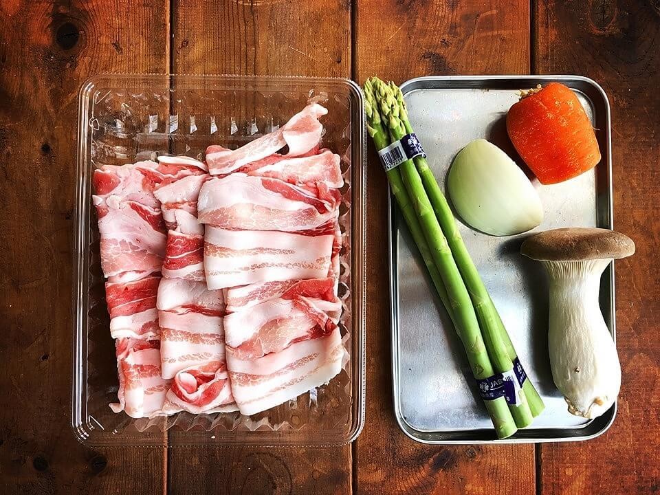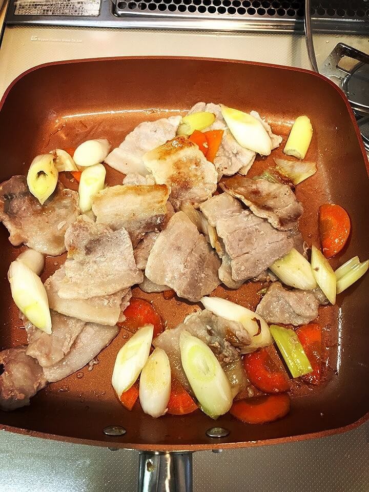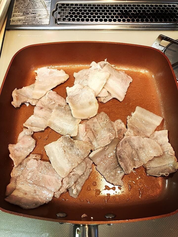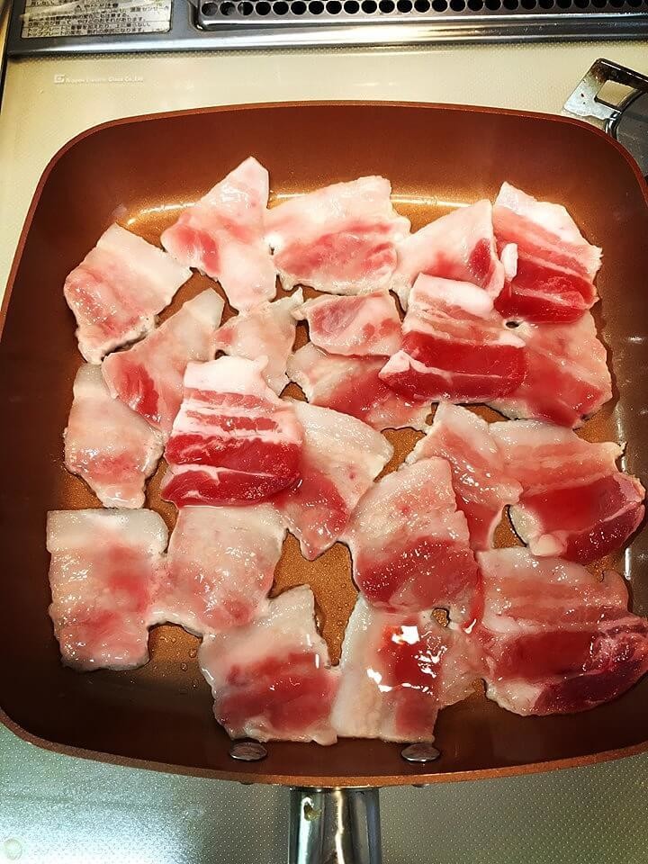 (1)熱したフライパンに豚バラ肉を入れて、炒めます。