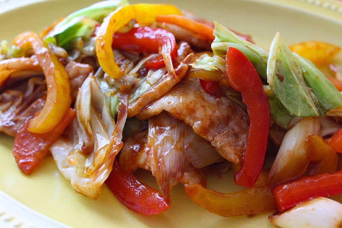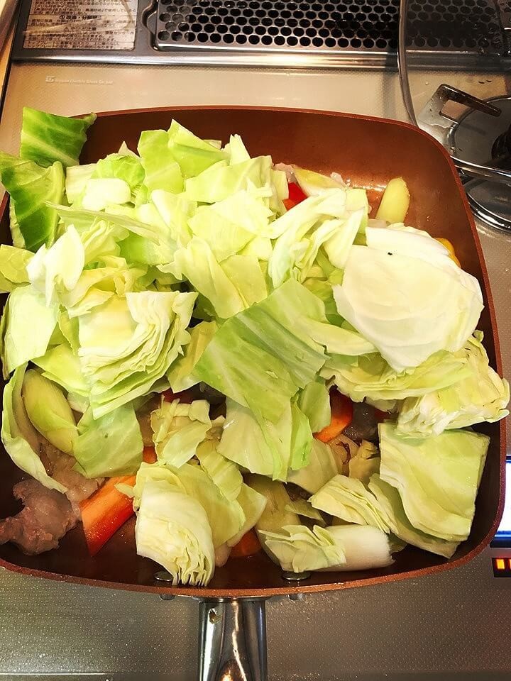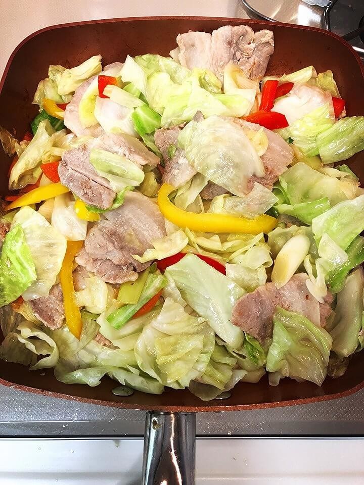 (2)肉の色が変わったらにんじんと長ネギを入れて炒め、さらにパプリカとキャベツを加えて全体を混ぜます。