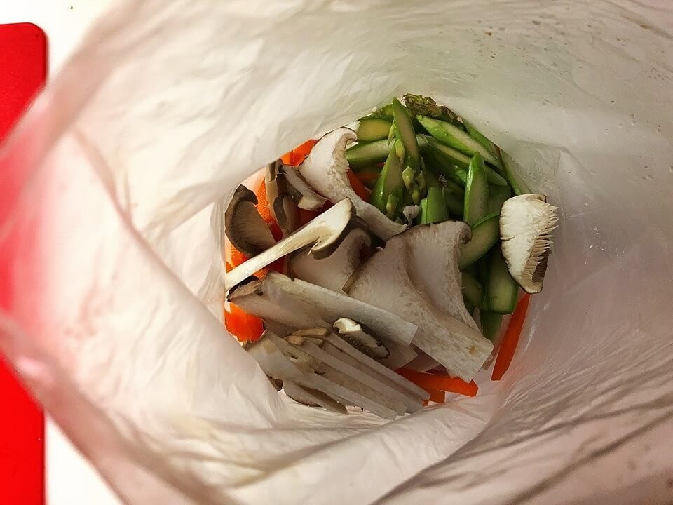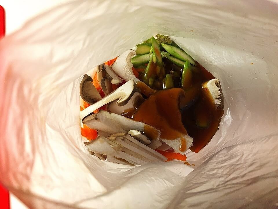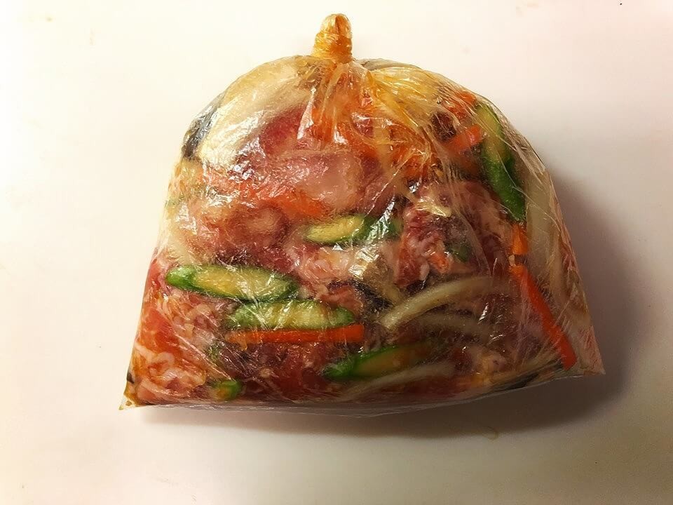 (1)材料をすべてビニール袋に入れ、「プルコギの素」を加えて全体を揉み込みます。