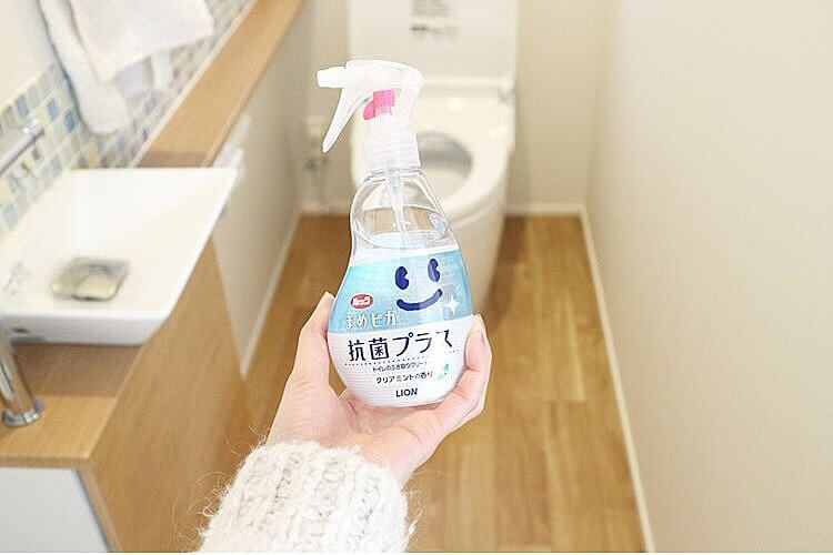 トイレの床、壁、本体、手洗い場までマルチに使えて愛用しているのがまめピカクリーナー。気になるところにシュッとスプレーし、トイレットペーパーで拭き取るだけ。サラッとし、爽やかな香りが立ち込みます。