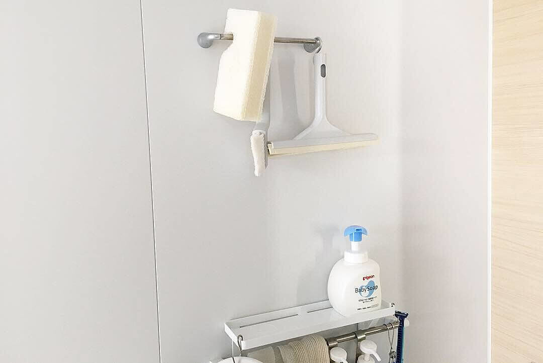 お風呂内に吊り下げ収納してある掃除道具が、スキージーとブラシたち。