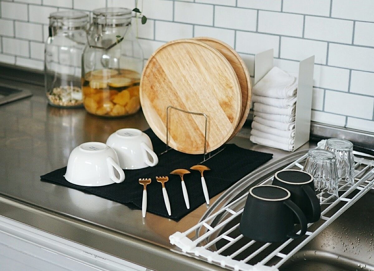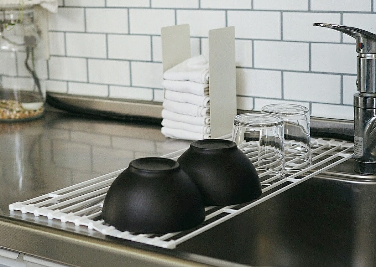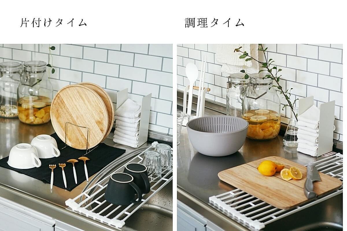 ちなみにお皿を洗うときは、写真のようにプレートスタンドやまな板スタンドなどを併用すればさらに省スペースに。