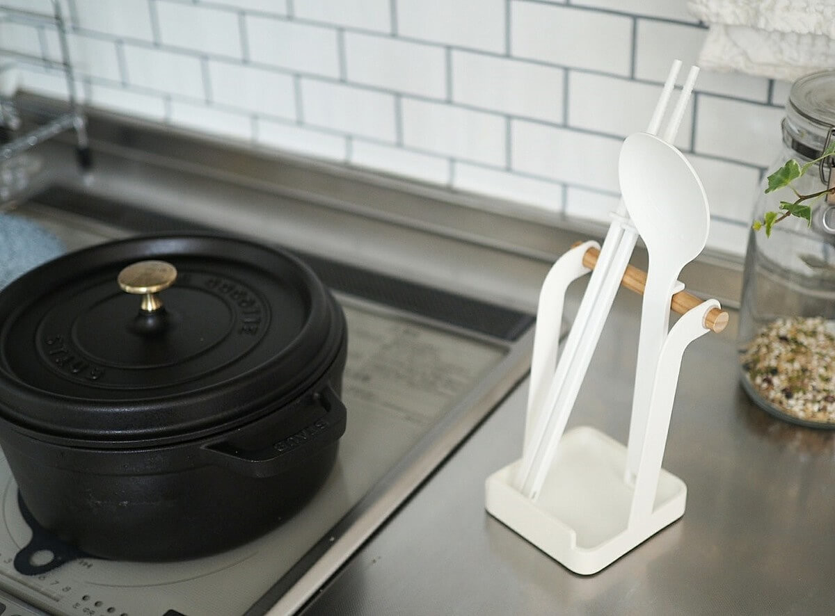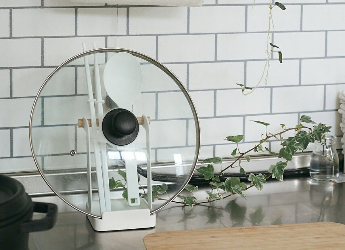 また、鍋ふた以外にも調理中の必需品であるおたまや菜箸も一緒におけるので、作業スペースがスッキリするだけでなく、効率的にお料理ができ、時短にもつながります。