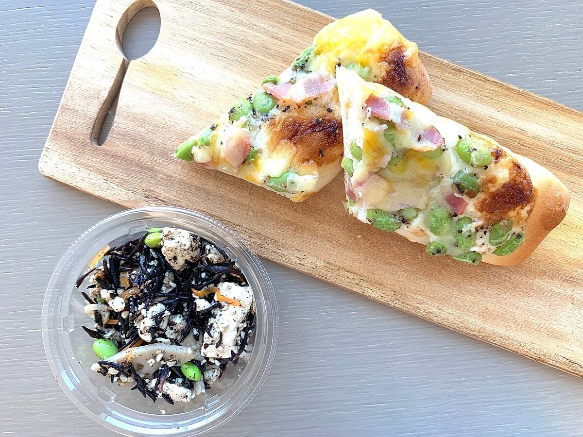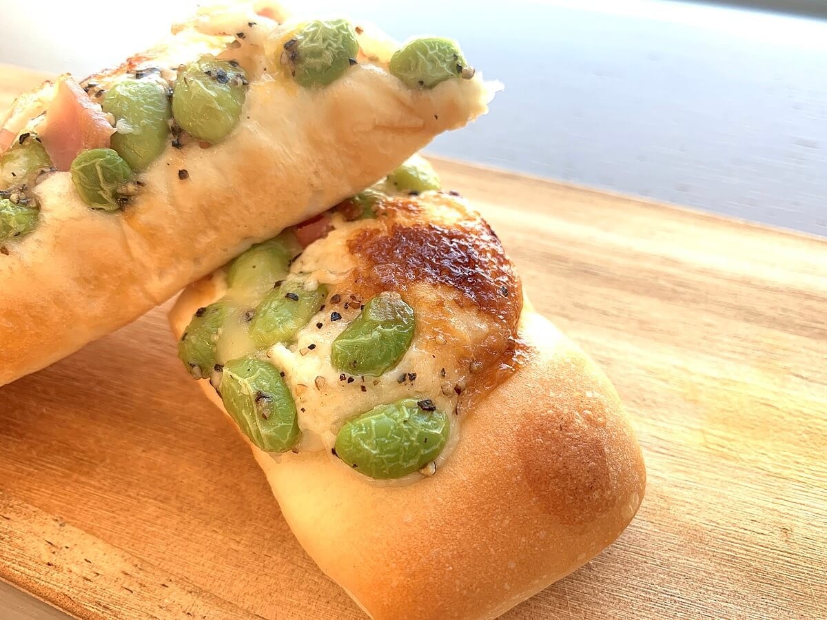 これぞお惣菜パン!というくらい、枝豆やらチーズやらがゴロゴロと乗っています。