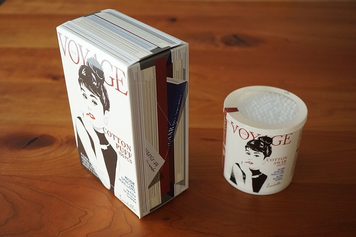 雑誌のようなパッケージがかわいいコットンパフと、おそろいのデザインの綿棒。