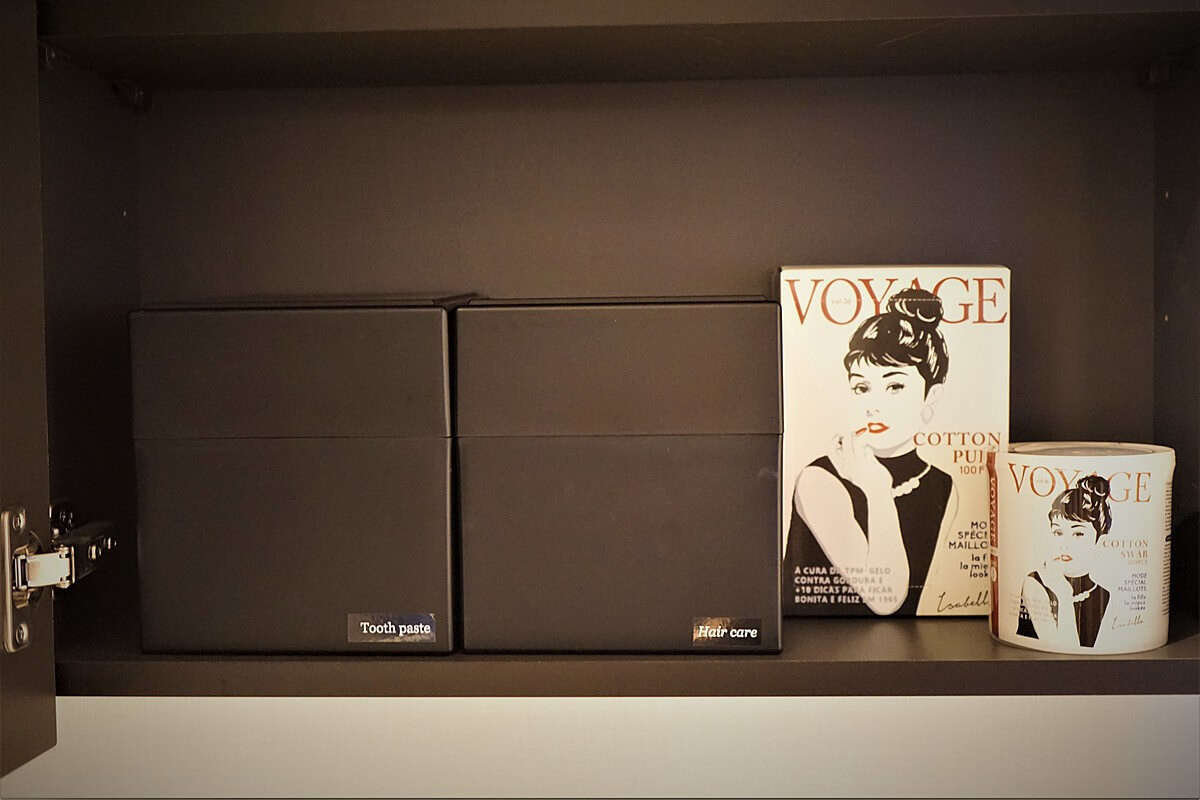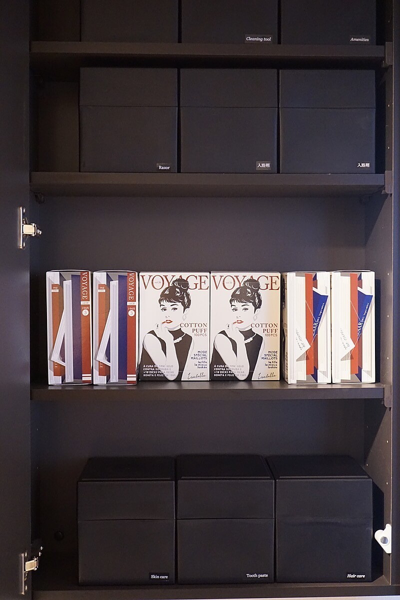 サイズ 10.5×6.3×16.3cm・コットンパフ100枚入り - 写真右:綿棒 Voyage・・・107円(税込)