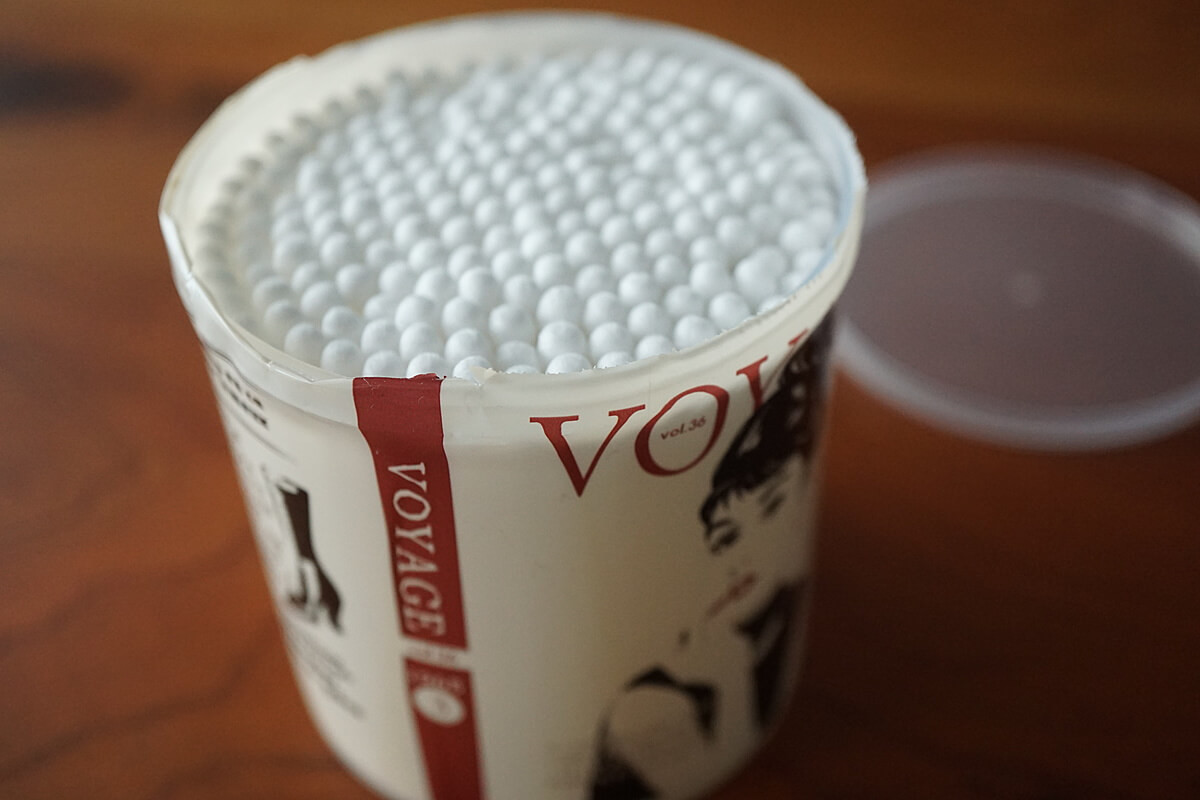 綿棒 Voyageは、パッケージをいかすためすために、上部のフィルムをはがす部分はほんの少しです。