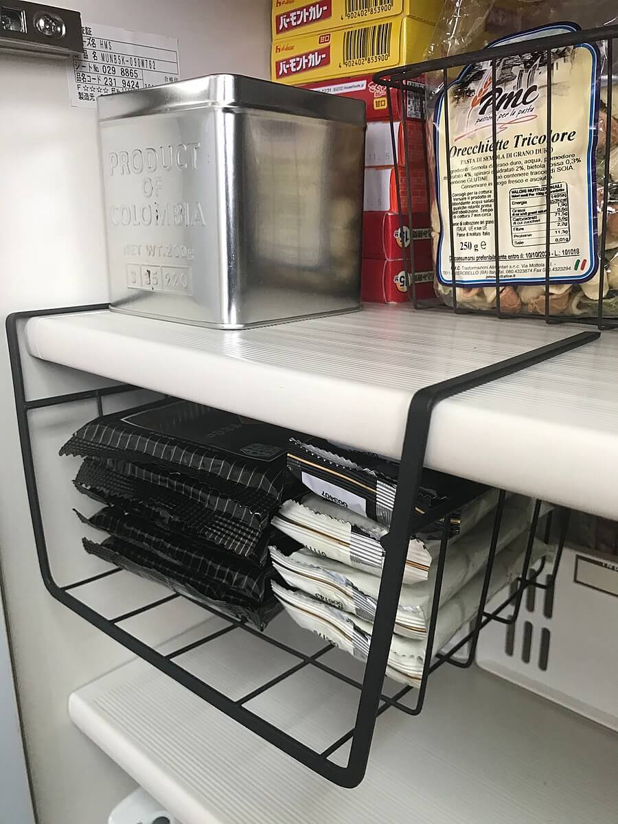 吊るすことで、棚の下側にもモノを置くスペースができました。
