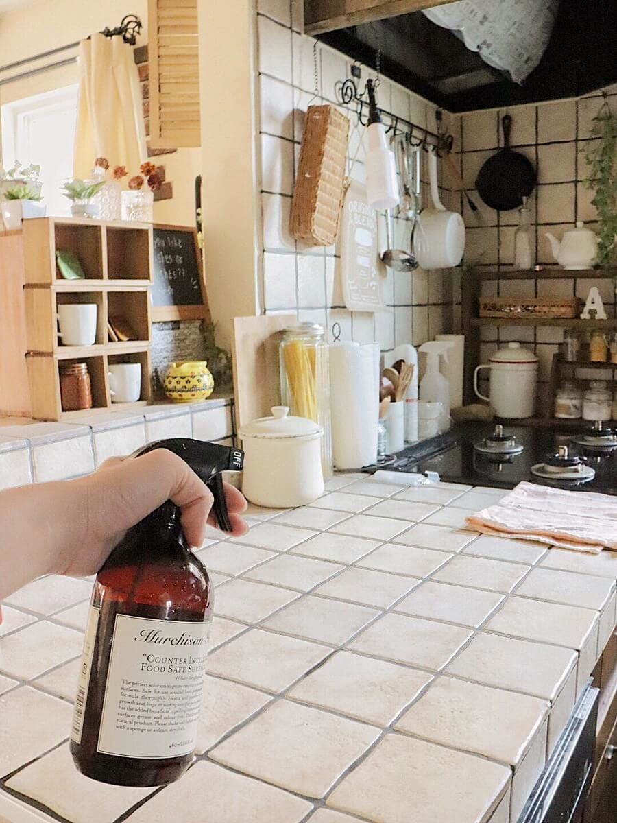 油汚れを蓄積させないために、洗剤をつけて布巾でキッチン全体を拭きあげます。 スムーズに行うためにわが家では洗剤を出しっぱなしにしています。