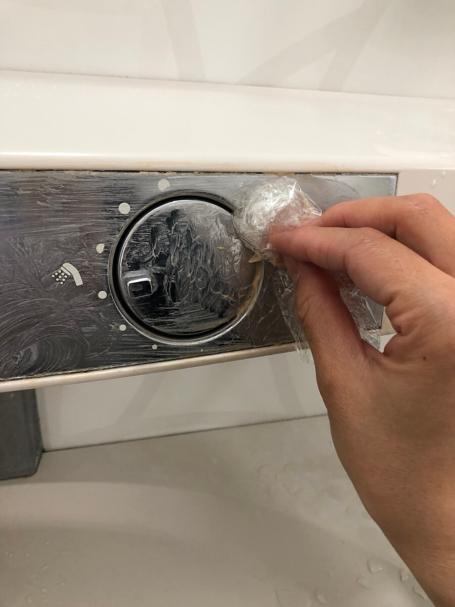水垢汚れの気になる部分にひたすらラップで擦りつけます。目安として1分くらいは同じ箇所を磨き続けました。