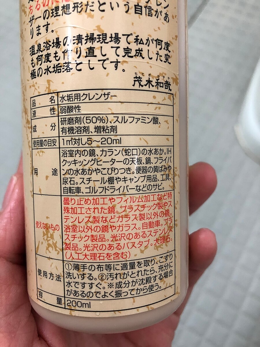 また、茂木和哉には様々なシリーズがあり、私が今回使用したものは浴室内の鏡や蛇口周りの水垢には使えますが、人工大理石のシンクやお風呂のバスタブには使えません。