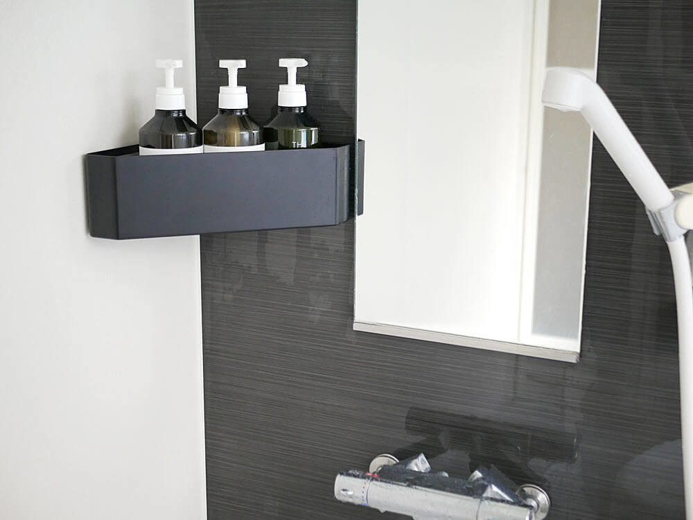 シャンプーなどのディスペンサーや洗顔チューブなどバス小物の収納にも便利なコーナーラック。