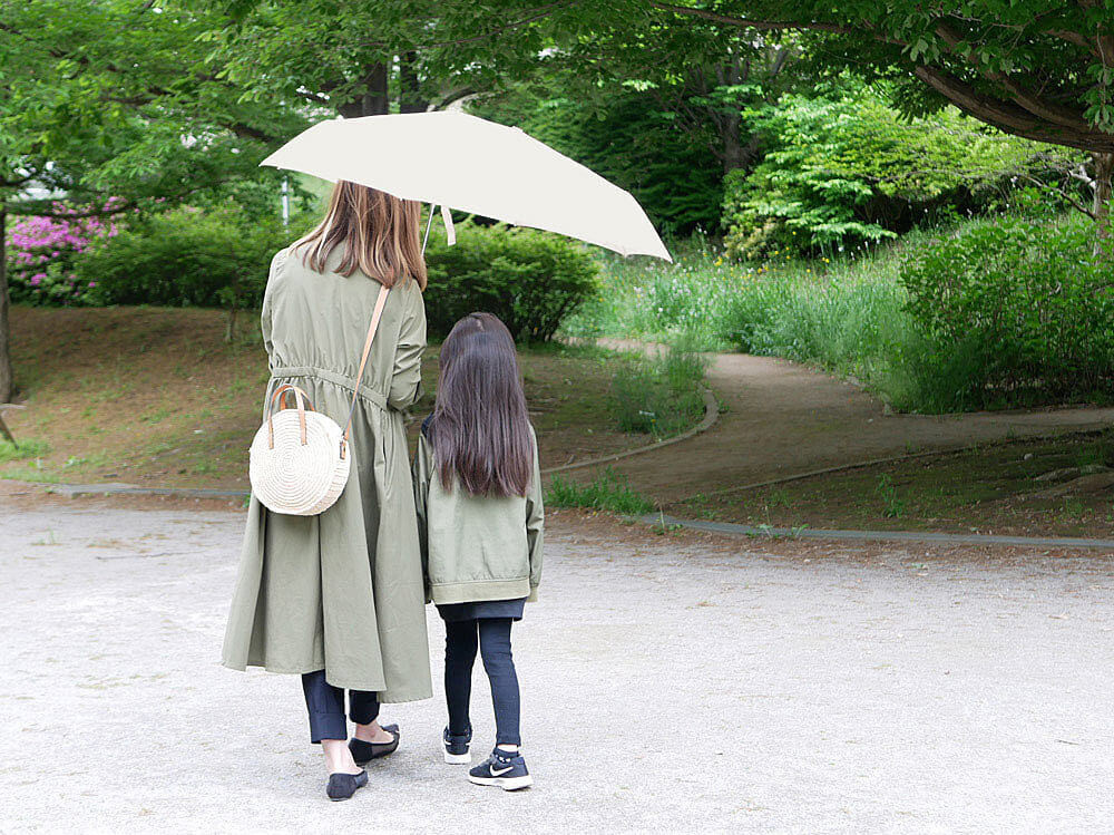 最長幅110cm、最短幅90cmで大人2人でも十分に傘に入ることができ、抱っこ紐で赤ちゃんを抱っこしているお母さんなら、傘の広い面を前にすることで赤ちゃんも雨から守ってくれます。