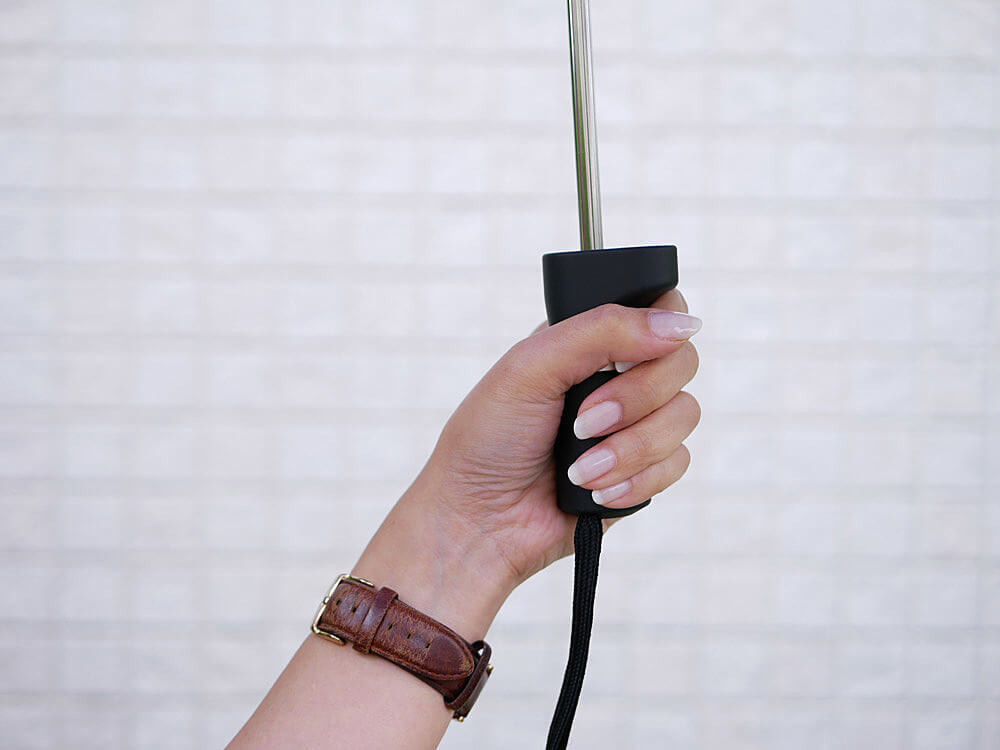 シェアリーは人間工学に基づいた設計で自然に持つと、持ち手の逆側を広く差すことが出来るので、体を濡らさず雨からしっかりと守ってくれる頼りになる折り畳み傘なんです。