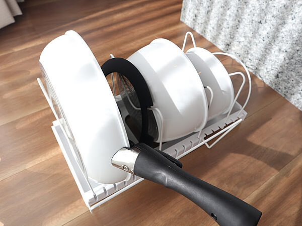 フライパン・鍋・フタを、各々自立させ、一気に”立てて”収納することができます。
