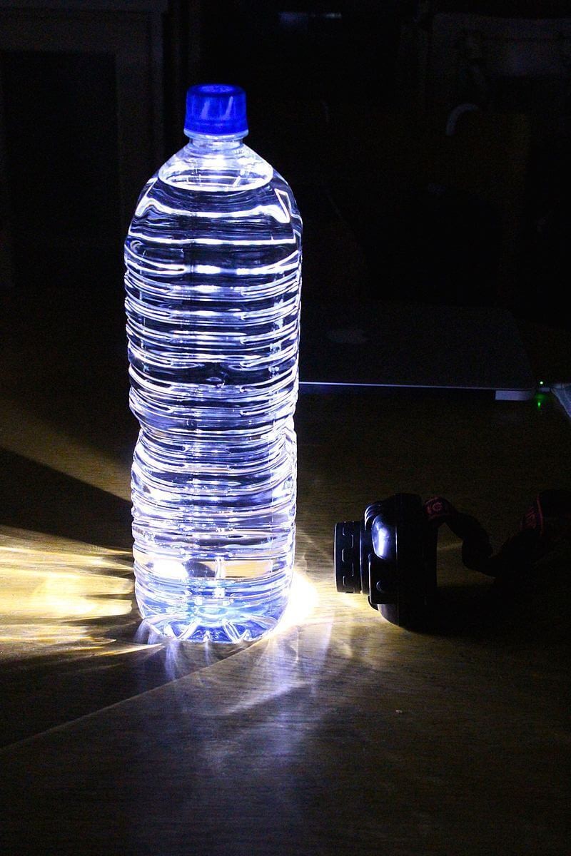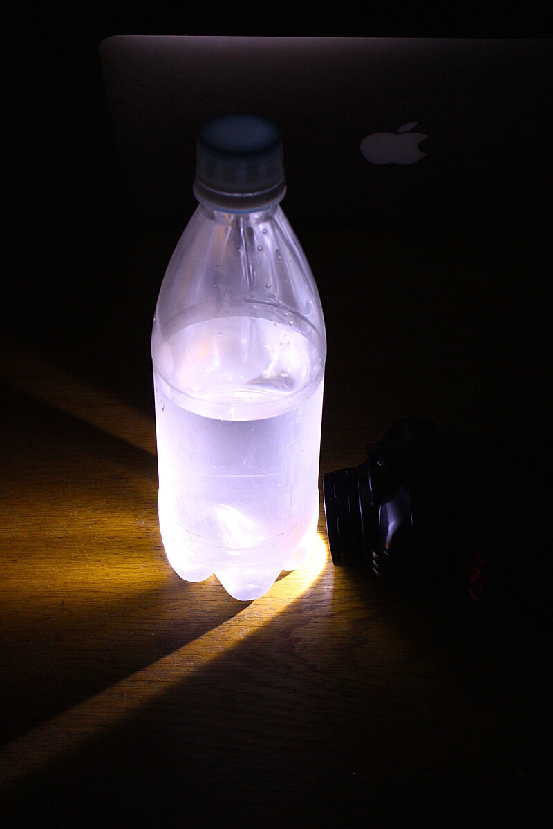 このように、ライトの光をペットボトルに近づけると、光が広がります。