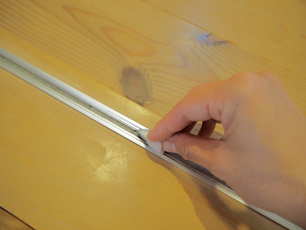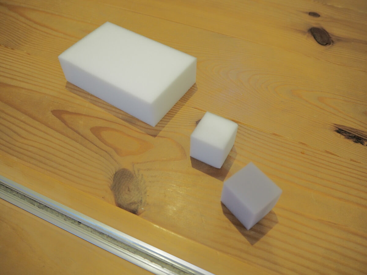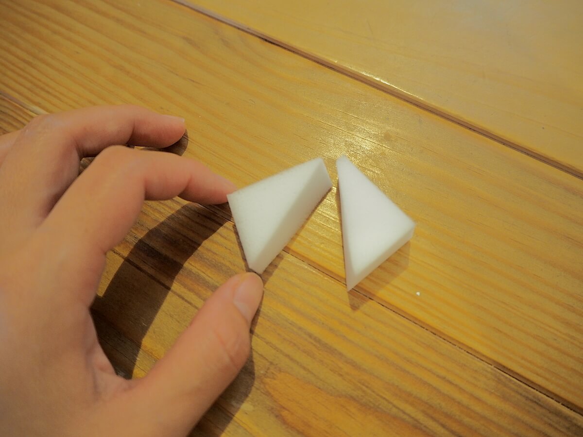 このメラミンスポンジをちょうどいいサイズにハサミでカットして使いました。レールの隙間に合うように、私は三角形にカット。
