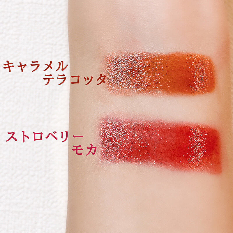 唇にのせてみると、キャラメルテラコッタは見た目よりも少しオレンジっぽい色味。