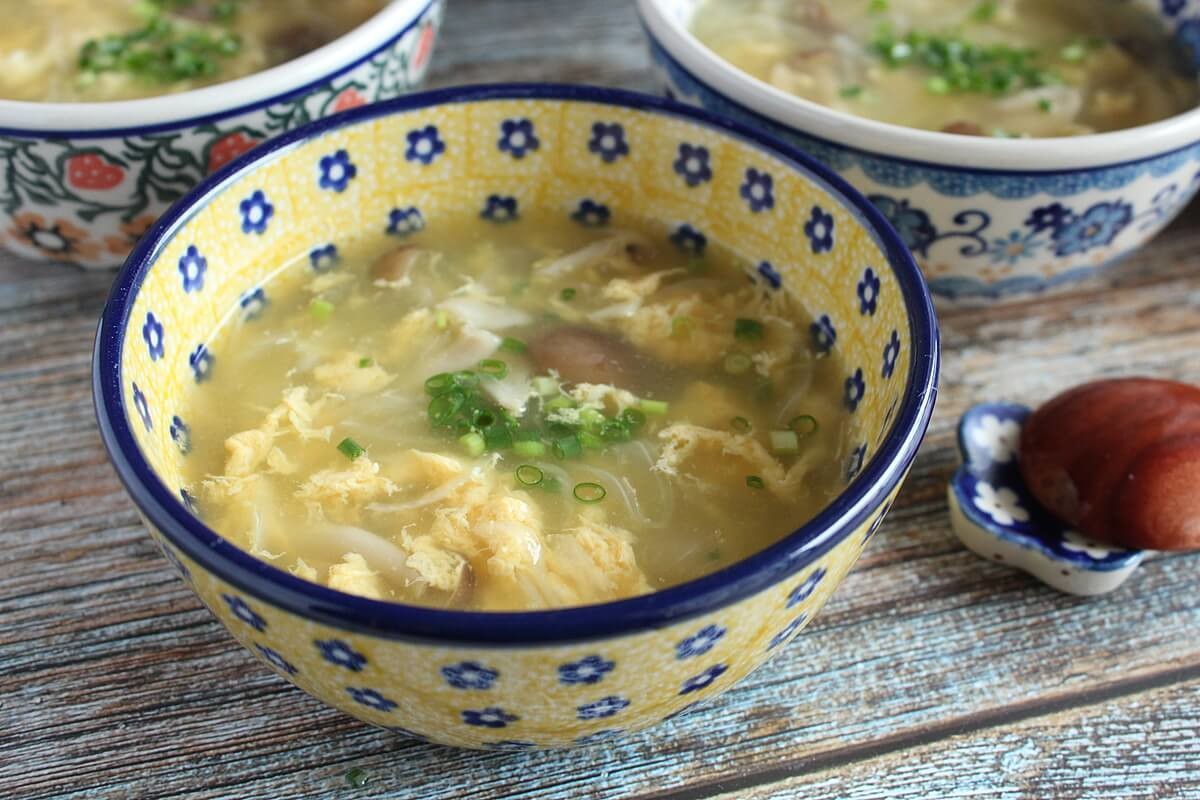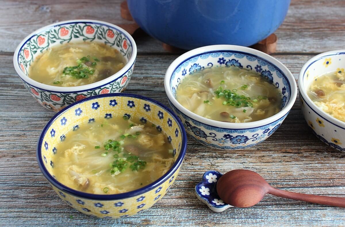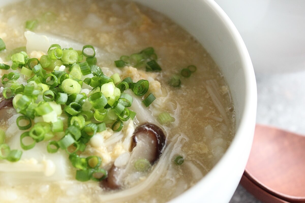 割りほぐした卵1個を回し入れ、再沸騰したら、塩で味を調え、小口切りにした小ねぎを入れてできあがり。