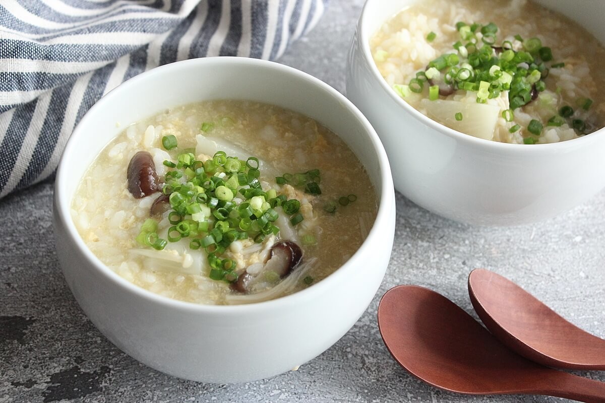 チキンストックで材料を煮込み、ご飯を入れてさっと煮込み、卵を回し入れたらできあがり!