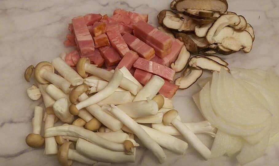 ブロックベーコンは上記写真のように切り、しめじは石づきをとりほぐしておく。フライパンにオリーブオイルを入れ加熱し、玉ねぎ、ベーコン、しめじ、しいたけを炒める。