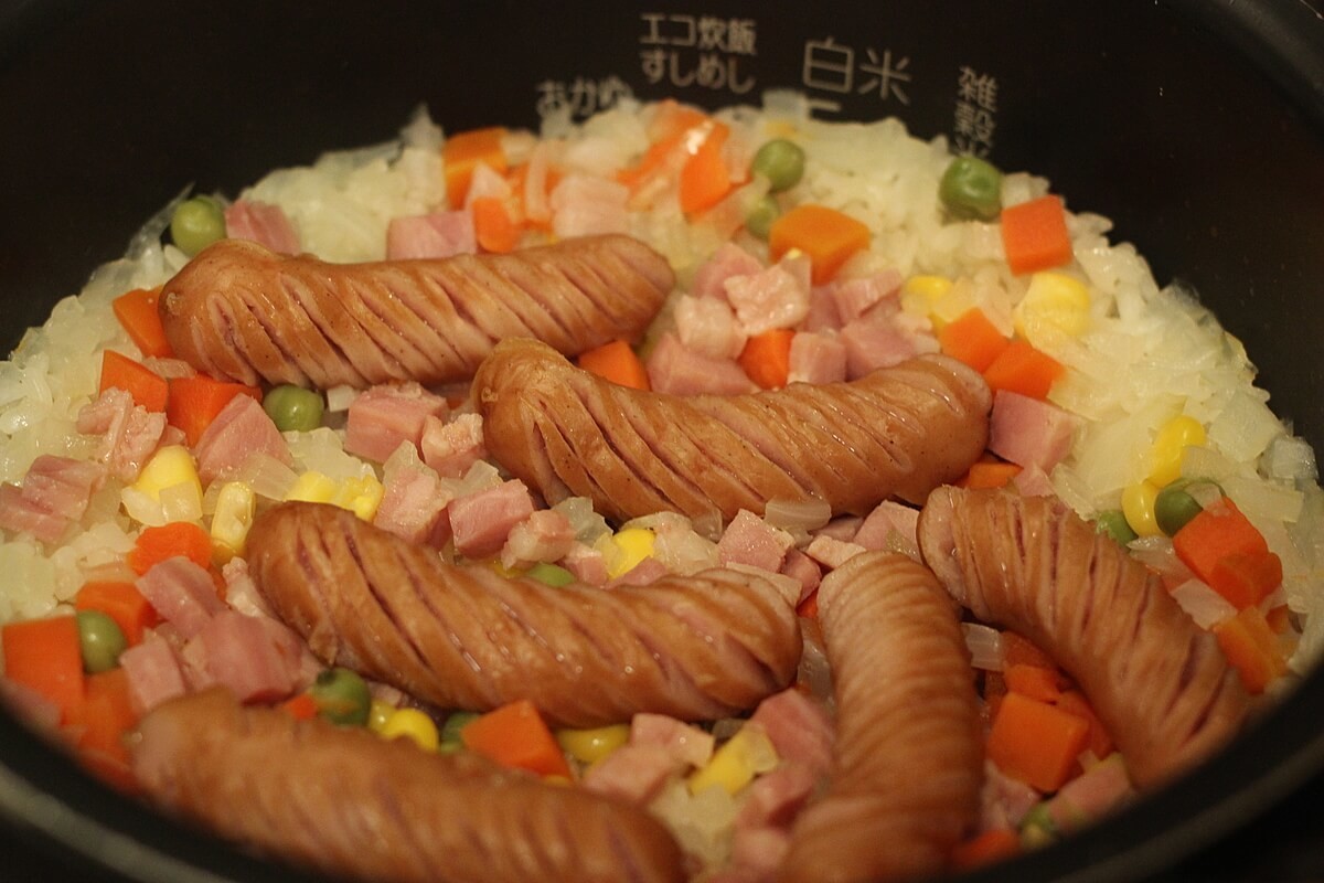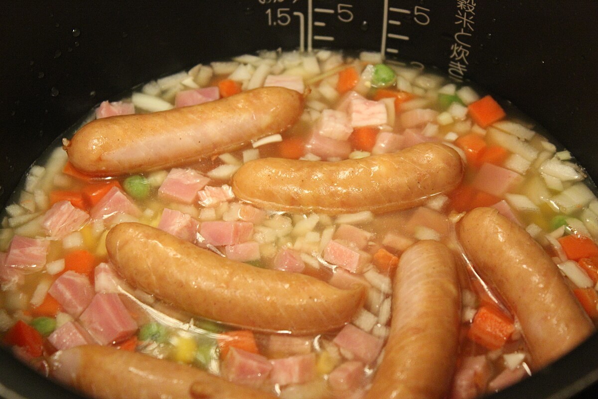 (野菜から水分が出るため少な目にしています)塩を入れよく混ぜてから、玉ねぎ、ミックスベジタブル、ベーコン、ウィンナーを入れ、炊く。