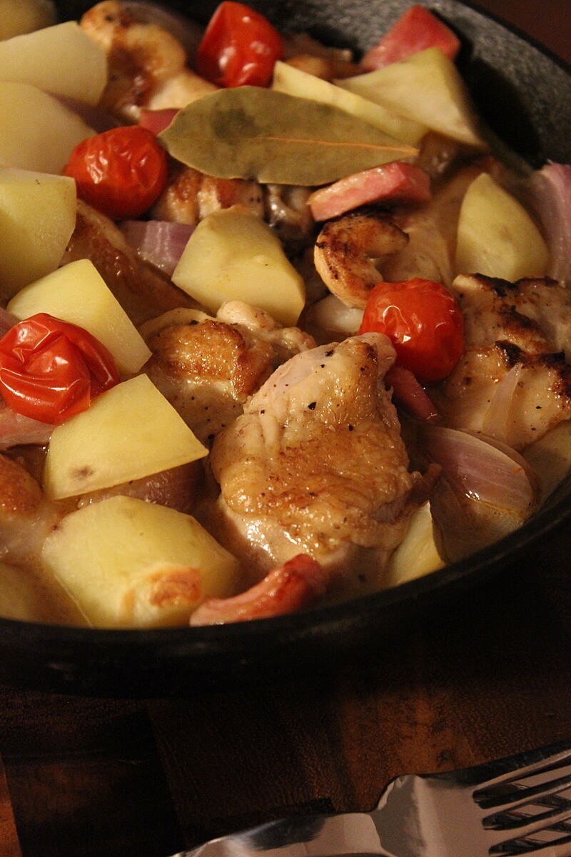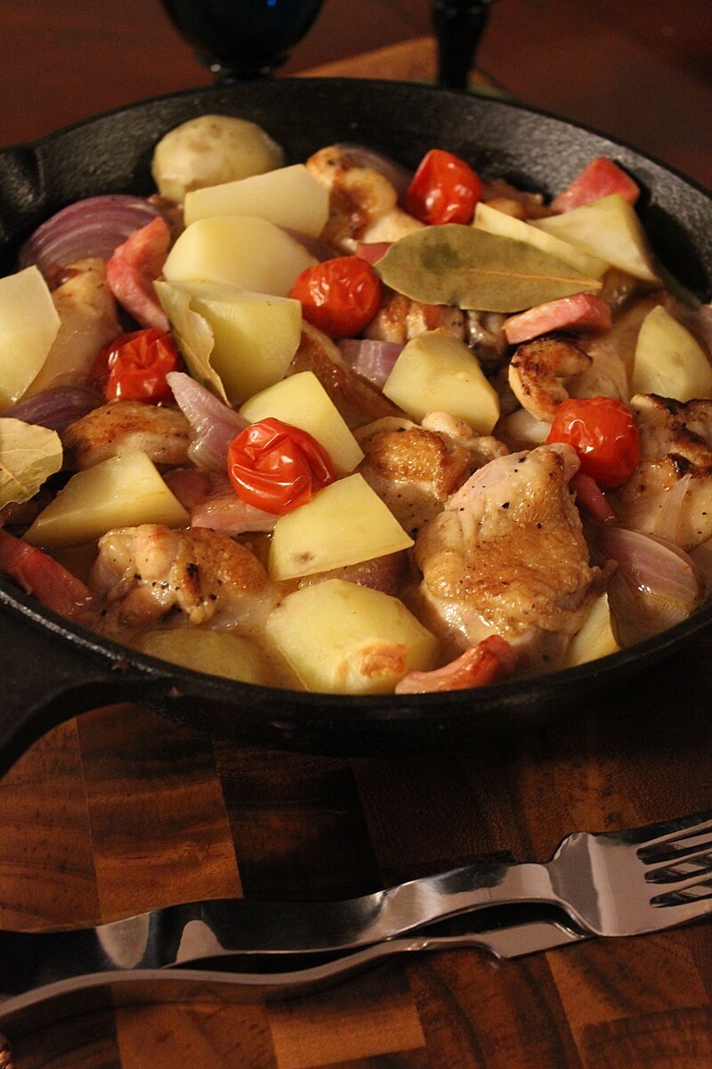 スキレットの3分の1ほどまでチキンストックを入れ、ジャガイモ、紫玉ねぎ、ベーコン、プチトマト、ローリエを入れたら、蓋をし、200度のオーブンで、50分~1時間ほど蒸し焼きにする。
