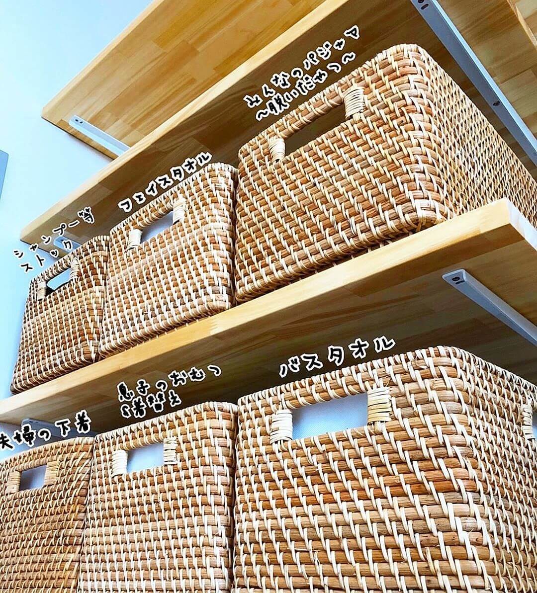 ナチュラルな編み目がかわいい積み重ねバスケットは、便利ボックスとして脱衣所でも大活躍♪下着やタオルだけでなく、かさばるストック類まですっぽりおしゃれに収納できる優れものです。