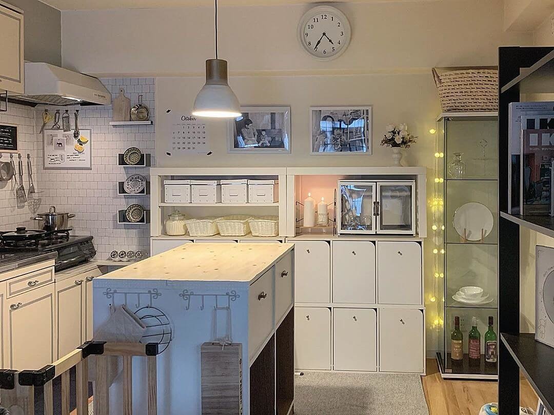 @room.reさんはこのNカラボの横置き2段を2つ並べ、上にIKEAの棚を置いてカスタマイズしているそうです。白で統一感があり、海外のおしゃれなキッチンが再現されています。