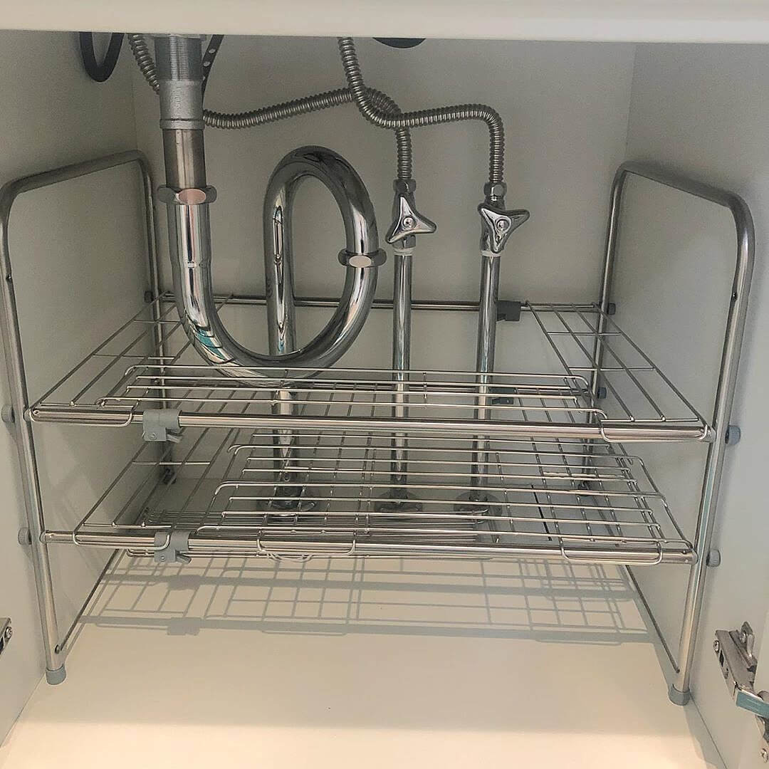 収納上手さんは、外からは見えないシンク下の空間も、無駄なく活用しています。 ニトリのシンク下ワイヤーラックは、スペースに合わせて横幅の調節ができるので、ぴったりはまります!