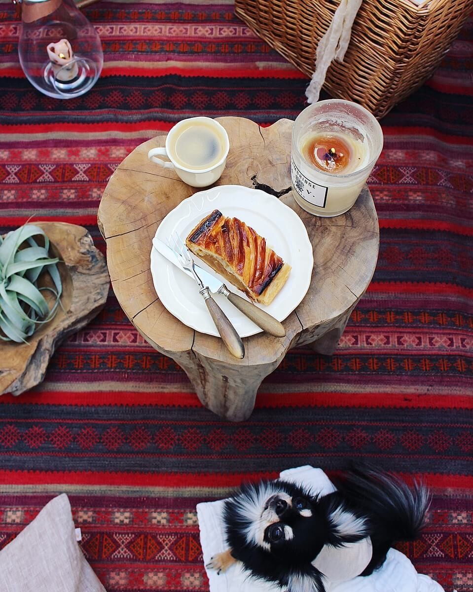 まずは、お気に入りのリサイクルウッドの丸太を削り出して作られたウッドスツールをテーブルに!
