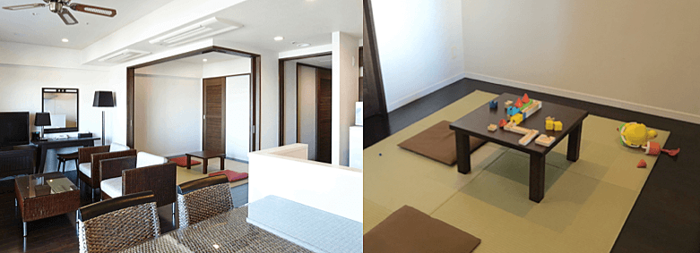 「東急バケーションズ」のお部屋の特徴は、ほとんどが約70㎡・スイートルームクラスの広さ。お子様が大きくなると、特にホテルでは、3〜4人で1部屋を予約することは難しくなりますが、約6名定員(※)のこの広さなら、ご家族みんなで泊まれます。(波多野さん)