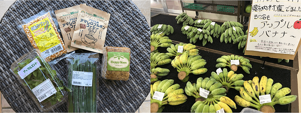 ご当地ならではの食材たち。おんなの駅では「アップルミント」と「レモングラス」を購入。Sさんは、レモングラスの葉を、ハーブティーとして淹れ、残ったぶんはお風呂に入れて楽しみます。
