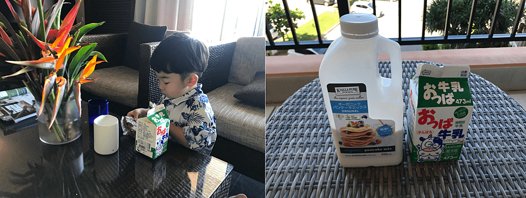 自宅から送っておいた「コストコのパンケーキ」を、沖縄限定のミルクで作り、地元のマンゴーを添えていただいたそう。なんて贅沢!