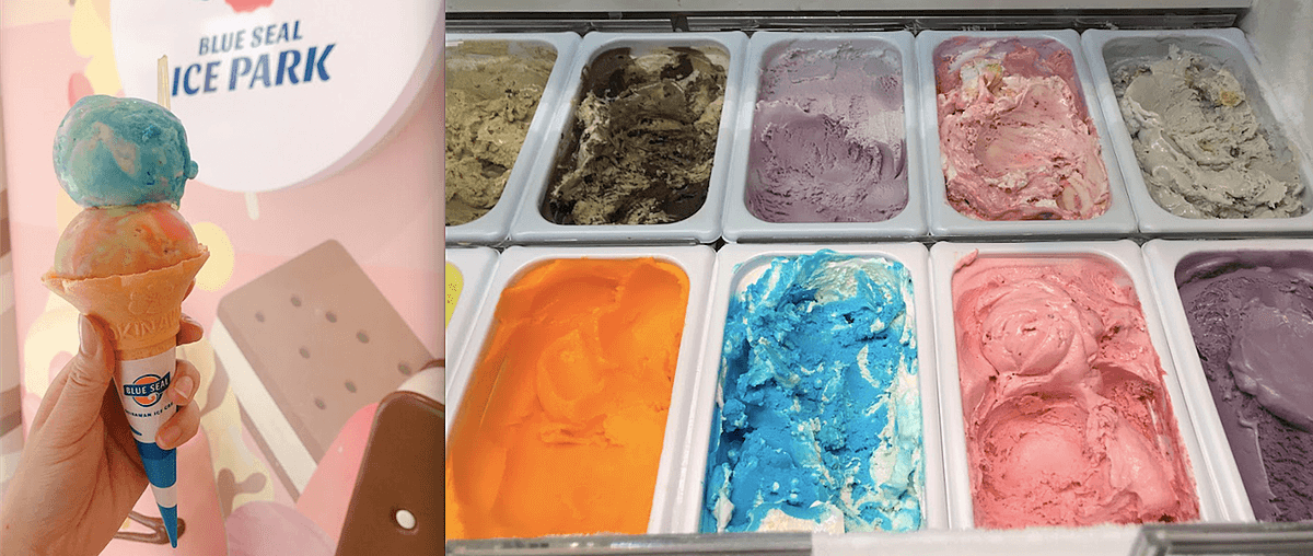 アメリカ生まれ沖縄育ちの「ブルーシール」。カラフルでまろやかなアイスクリームは、観光客だけでなく地元の子連れ家族にも人気。