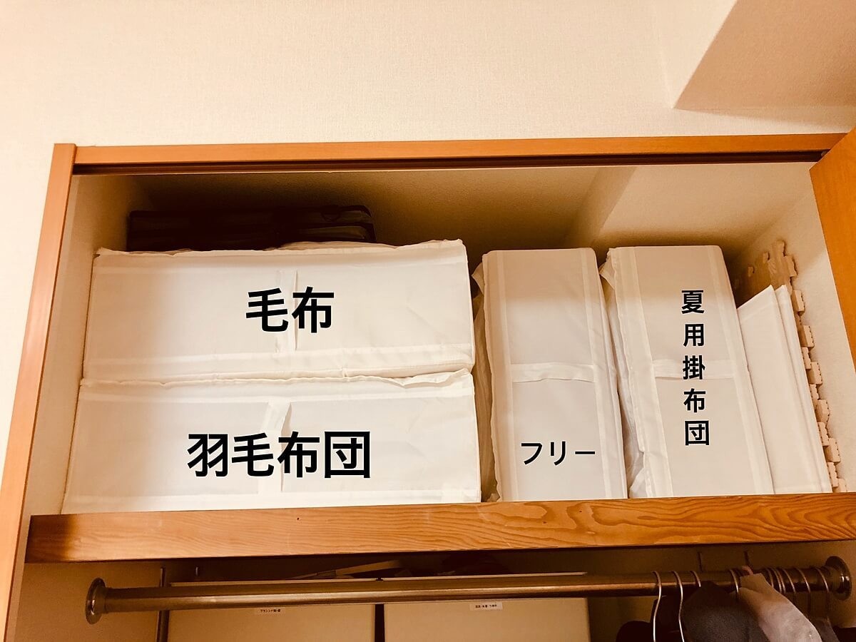 よくブログやSNSで紹介されているのを真似して、我が家も掛布団などの寝具を収納してみました。