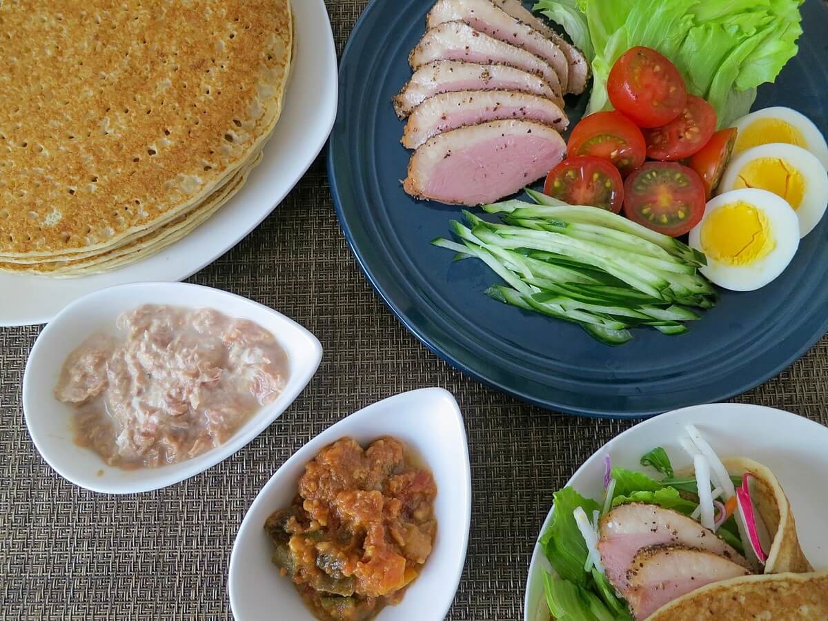 手巻き寿司のように、それぞれが好きな具を巻いて食べる「手巻きクレープ」は、大人も子どもも楽しめるメニューです。