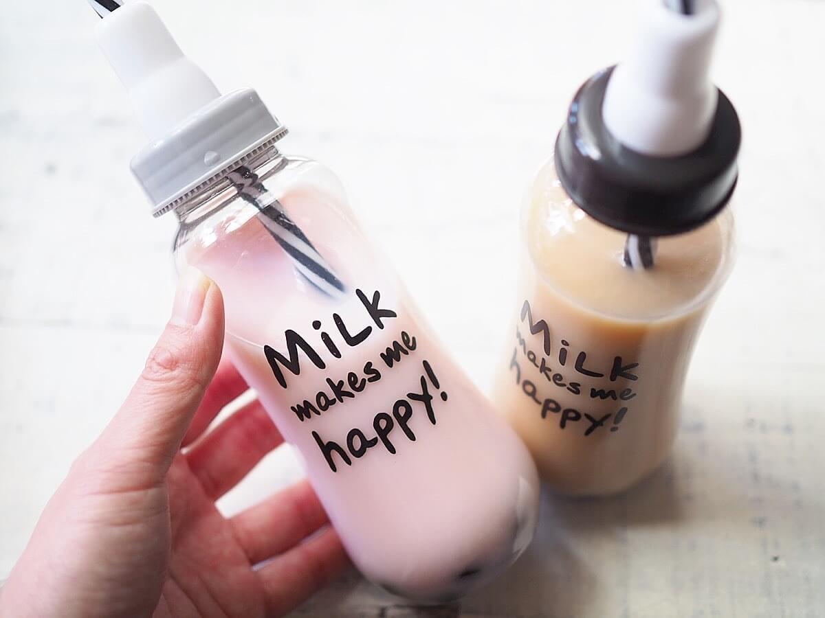 中に、タピオカ入りいちごミルクと、タピオカ入りミルクティーを入れてみました。