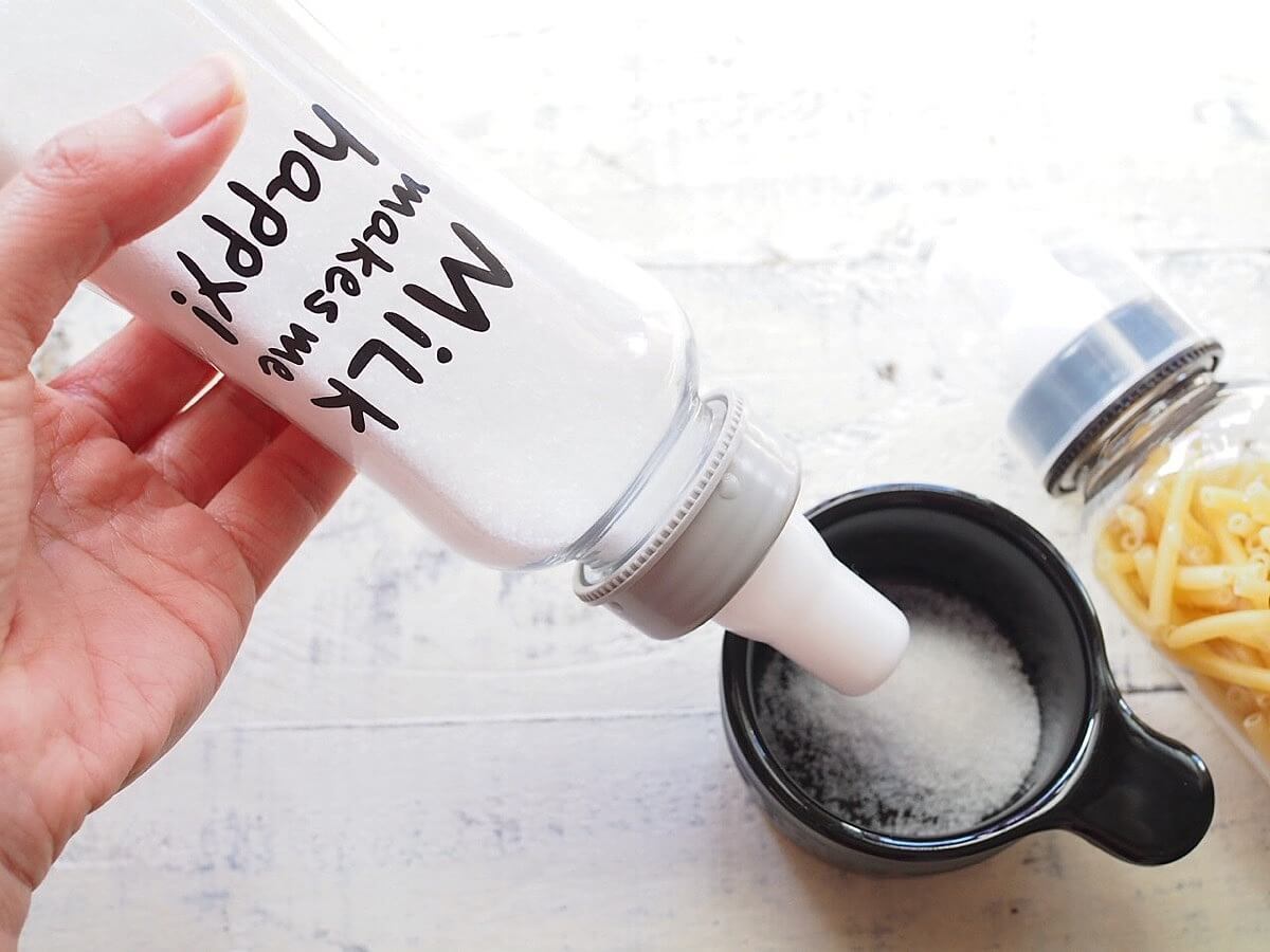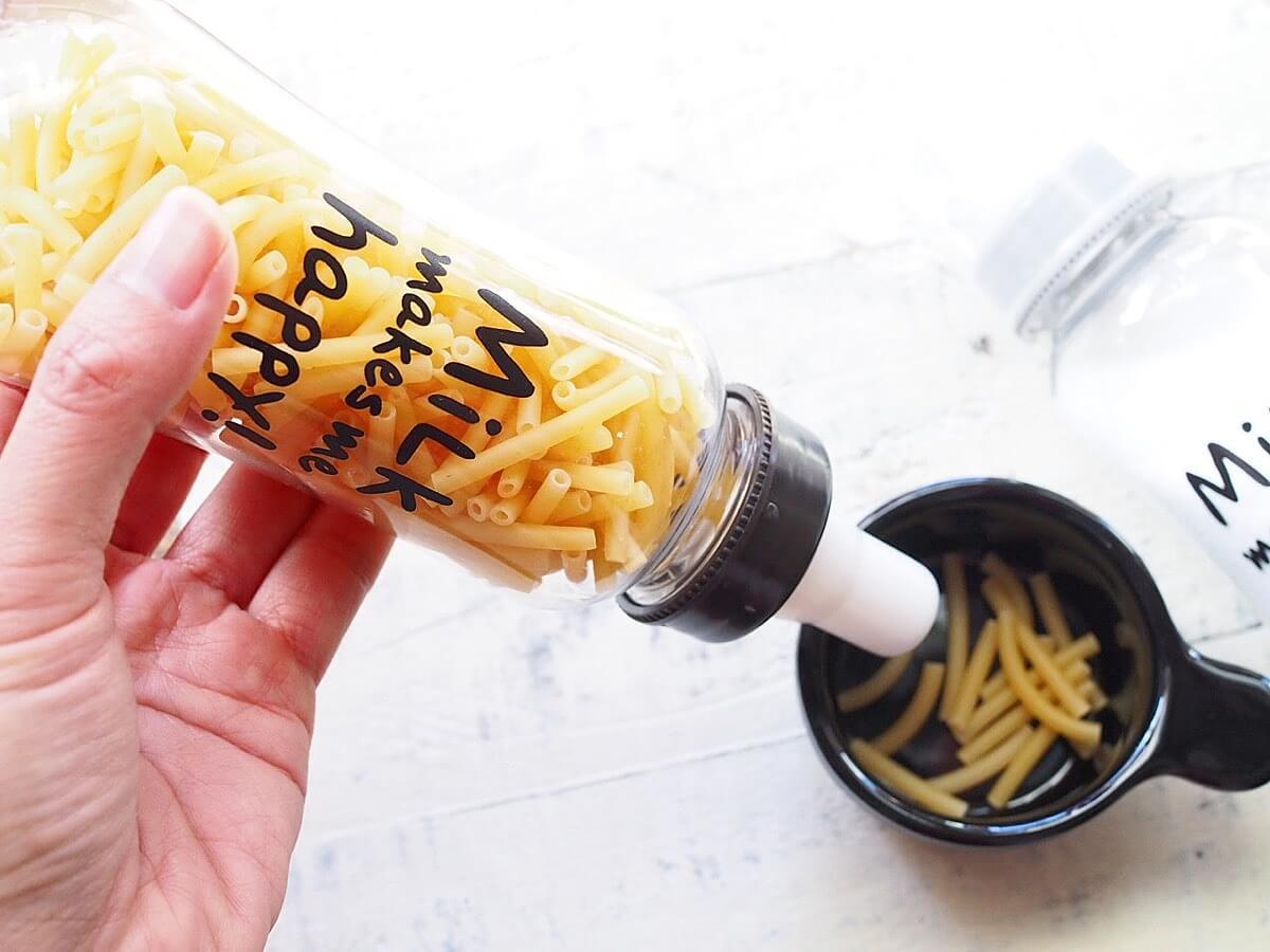 また、飲み物だけでなく「マカロニ」や「グラニュー糖」などの食品を入れて、見せる収納に使ってもかわいい♪