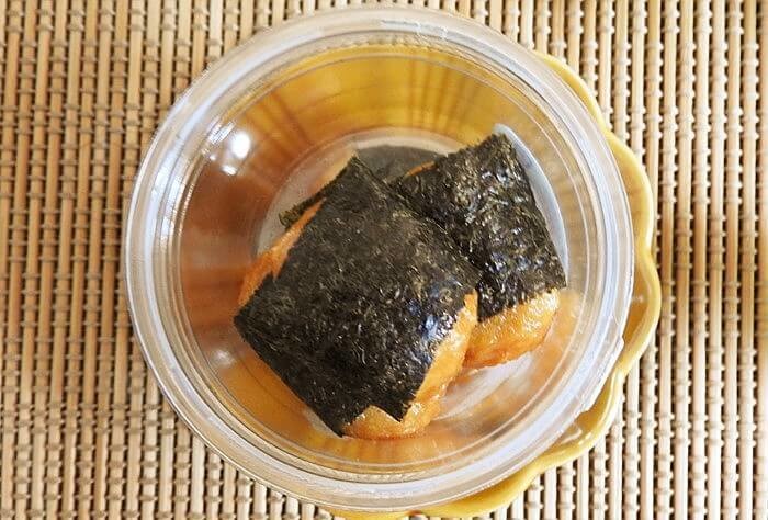 粉末醤油入りのお餅に特製醤油のたれをまぶして、有明産の海苔でまかれたいそべ餅がカップの中に入っています。