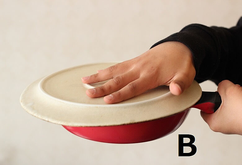 写真Aのようになったら、フライパンより大きなお皿を蓋をするようにかぶせ、ひっくり返してお皿に出し(写真B)ます。
