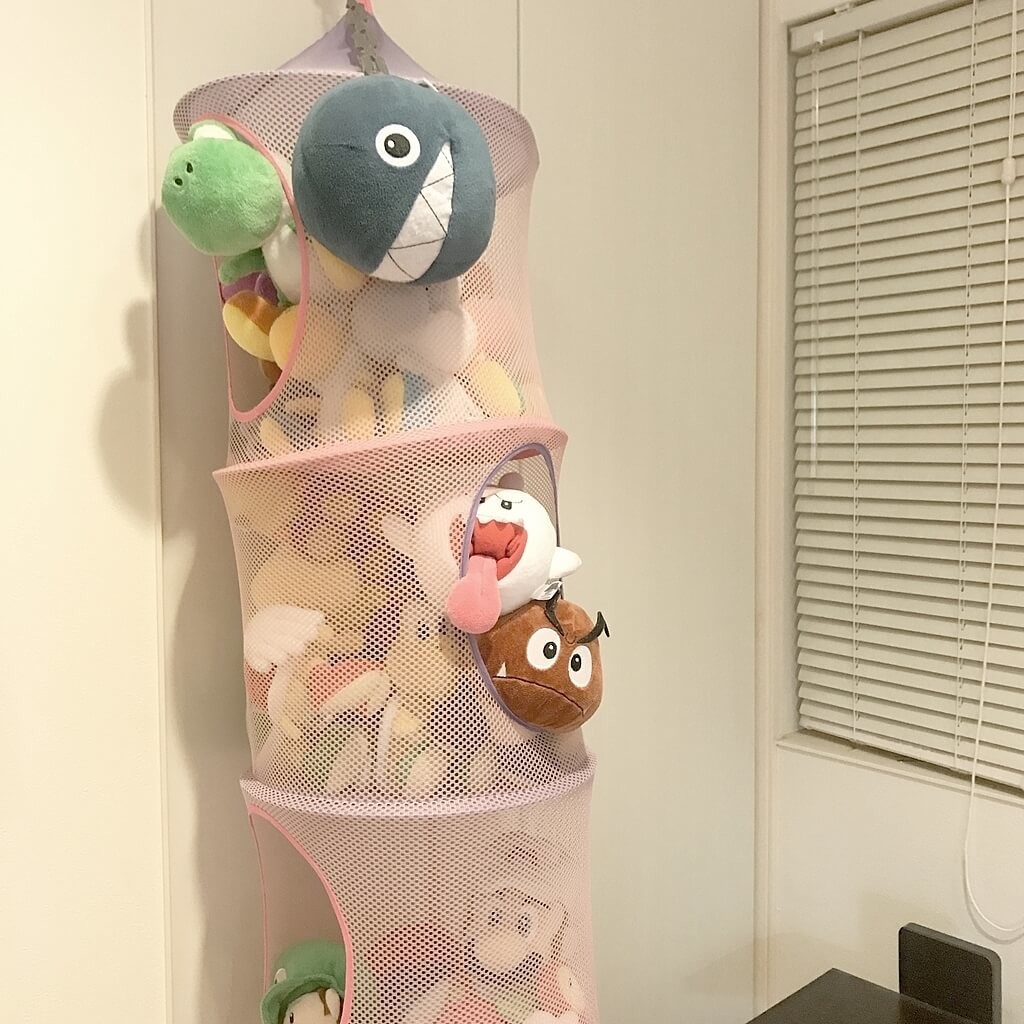 かさばるものの代表のぬいぐるみ。引き出しにしまうわけにはいきません。 わが家ではIKEAで買ったぶら下げるメッシュ収納に入れて飾る収納。