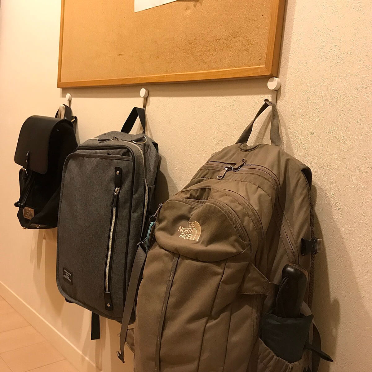 特にかさばるのはランドセル。学習机には横にランドセルを吊るせるフックがついていることもあります。もしフックがない場合でも、ホームセンターなどで石膏ボードの壁でも10キロまで吊るせるピンで刺すだけのフックが売っていますので、壁などにランドセル専用の場所を作りましょう。