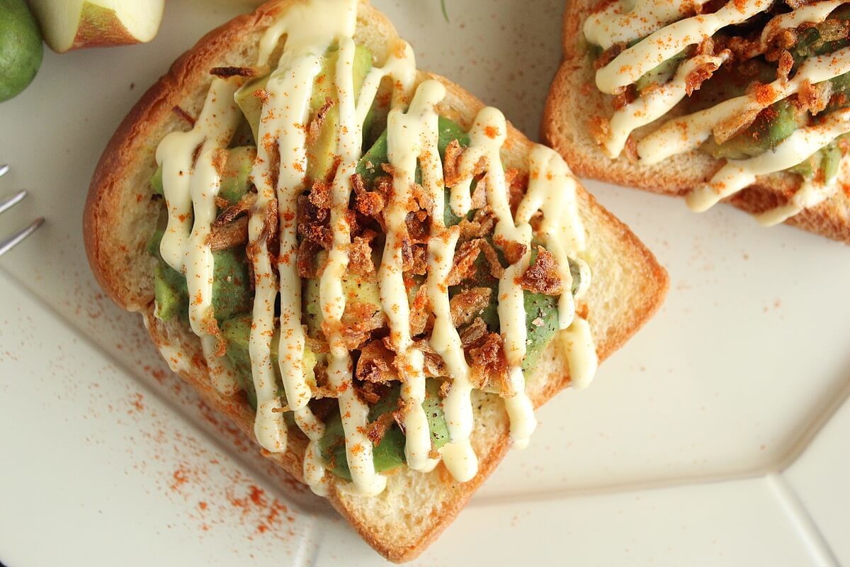 1. ビール酵母パンにアボカドを8~9個のせ、フライドオニオンを全体にのせる。