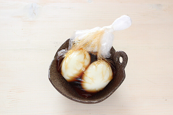 - 粗熱が取れたら殻をむき、ビニール袋にめんつゆと共に入、れ空気を抜くように結び、冷蔵庫で1時間寝かせれば完成!