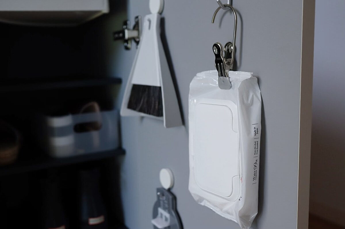 以前、置いていた鍵やおしりふき(掃除用)などは靴箱の扉裏に掛ける収納に、